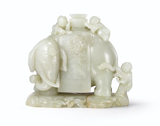 器以整塊籽玉雕琢而成,玉質(zhì)溫潤飽滿,呈脂玉特有之潔凈。象作回首狀,體態(tài)優(yōu)美,厚實逼真;三個童子表情逗趣天真,活潑可愛;象背披氈毯,毯上飾三爪龍紋飾,形態(tài)雄健宏偉,代表盛清統(tǒng)治者無限威權(quán)。此器最令人叫絕之處,在于象是立足于飾有靈芝奇石座上,此等珍妙巧思之創(chuàng)意,若非清宮造辦處玉作高手所作莫能成此佳器。傳世品中,以如此碩大和闐上等珍貴籽料及精湛巧藝雕琢瑞象立于奇石上之稀珍擺件未有所見。唯一與本拍品造型相似的一件站立于奇石上的玉擺件藏于美國大都會博物館,但材質(zhì)為碧玉,1902年Heber R. Bishop所捐贈,館藏編號02.18.740,可供參考比較。