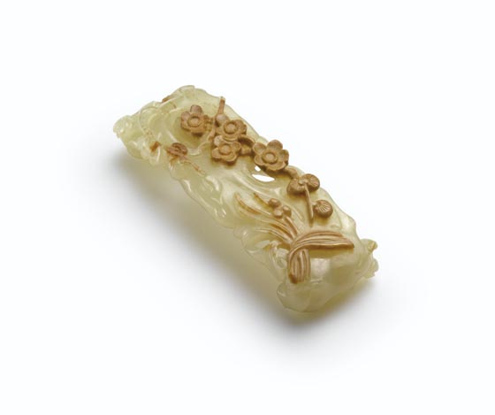 此墨床,雕工自然,流水行云,幽韻雅致。水仙、梅花,俏色巧雕,與半透明樹干反差絕妙。可比一相類光素黃玉墨床,現(xiàn)藏北京故宮博物院,刊于《故宮博物院藏文物珍品全集.玉器(下)》,香港,1995年,圖版174。另見光素白玉例,錄于《國之重寶特展圖錄:國立故宮博物院預(yù)祝建院七十周年高雄市特展紀盛》,國立故宮博物院,臺灣,1994年,編號52。