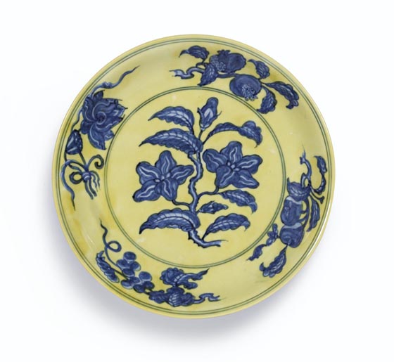 盤口微撇,弧壁,盤心略內(nèi)凹。通體青花黃地,其法為先燒制出青花折枝花果盤,然后于花紋外白釉地上涂滿黃釉,使?jié)庵氐那嗷ㄅc油亮的黃釉形成鮮明的對比。此盤里心繪折枝梔子花,內(nèi)壁繪石榴、柿子、葡萄、蓮實紋樣,外壁有纏枝花一周。外底白釉上青花雙圈內(nèi)楷書“大明弘治年制”六字款。嬌黃釉于成化時始出現(xiàn),但數(shù)量較少,到弘治時取得突出的成就,器物以盤碗為主。弘治朝官窯瓷器以嬌黃釉最為著名。這件青花盤就是以嬌黃釉涂地,使鮮麗的嬌黃與深艷的青花相映成趣,是一件頗具代表性的作品。