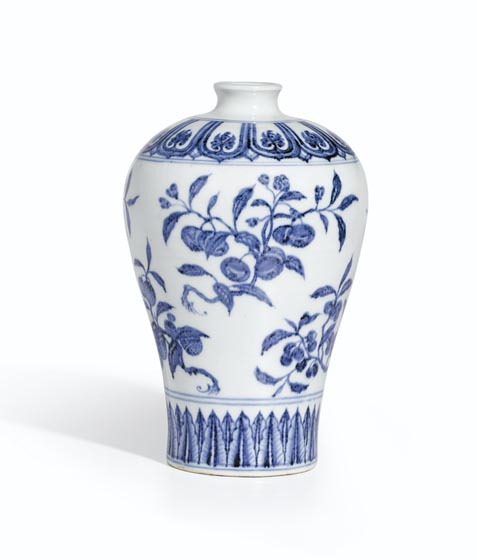 此梅瓶胎質(zhì)潔白,做工精細,青花畫工嫻熟。永樂時期使用的青花鈷料是一種稱為“蘇麻離青”的進口料,含鐵量較高,呈色濃重青翠,往往出現(xiàn)鐵銹斑疵。此瓶的青花鈷料即典型的進口料,在白胎的映襯下,罩于釉下的青花青翠濃艷,花果上布滿褐色的鐵結(jié)晶斑點,有如一幅傳統(tǒng)的水墨畫,暈散自然。