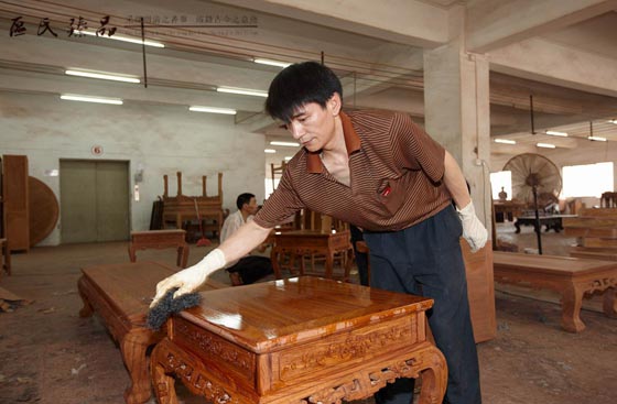 就像食物越天然越少加工就越健康環保越美味一樣,紅木家具最后一道工序上漆或打蠟,使用的漆、蠟越天然,家具就越綠色環保。近年來,越來越多企業選擇使用一些透明漆,這些漆雖然大多數也健康環保,工藝更是方便簡單,但是這樣生產出來的紅木家具,總覺得缺少一股溫雅的韻味,少了一份讓人細細把玩的魔力。
