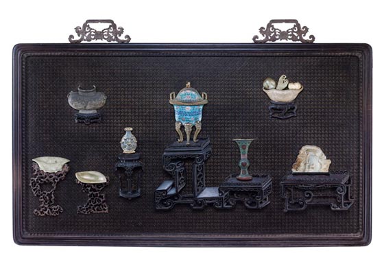 此掛屏在棕色披麻髹漆的板底之上,用數(shù)以萬計細(xì)若發(fā)絲的紫檀木條以萬字紋為單元入榫拼成“萬壽錦”,工藝超群。中間的紫檀鏤花高低臺座上置有鎏金琺瑯三足鼎式爐以及琺瑯長頸花觚。右上方的紫檀鏤花束腰臺座上之白玉盤里分別盛有青玉佛手、青玉壽桃以及象牙核桃,右下方的紫檀鏤花臺座上置有松鶴玉石山子擺件。左側(cè)下方的兩件根雕黃楊隨形臺座上分別置有青玉葵花六瓣洗以及青玉葉形盤,左側(cè)上方的紫檀鏤花束腰臺座上置有青銅蟬披獅耳壺。此外還有一件鏤花束腰高幾也以紫檀木所制,上面放置著一件充滿雅趣的琺瑯彩仿哥窯六連瓶。集鑲嵌、鎏金、琺瑯彩、鑄銅、拼攢、雕刻于一身,集盛世清宮工藝大成,所耗工時難以估量。配上雕飾工整得紫檀邊框及兩件皇庭風(fēng)格的鎏金掛扣,整體所展現(xiàn)的雍容華貴、景極工麗等氣質(zhì)均昭示著帝宮之相,真可謂“蓋以人力盡地利,補天工”。