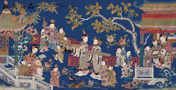 清中期 藍(lán)緞蘇繡庭院教子圖