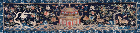 鳳蝶組成的二方連續(xù)的邊飾,花邊上又圈釘0.8厘米的平金邊飾。掛帳左邊桃樹(shù)上結(jié)滿并蒂仙桃,右邊樹(shù)上結(jié)滿并蒂佛手;中間主題繡一雙層仙宮樓閣,四周?chē)鷻凇⒙N檐挑山、懸掛垂鈴,上方是五彩云蝠翻飛,樓閣左右各有一只銜籌仙鶴飛臨,寓意“海屋添籌”、“洪福齊天”;周?chē)C海水山石、靈芝、菊花、海棠、牡丹等,競(jìng)相開(kāi)放。一切紋樣的祝頌主題均離不開(kāi)福、祿、壽—一個(gè)人們最直白的愿望被繡制成吉祥紋飾,含蓄的傳達(dá)給每一人,是一件極佳的慶壽禮帳。