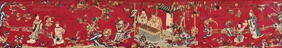此件蘇繡掛屏紅色緞地,緞地暗花,福壽圖案。繡三組人物,主體為繡一武官身披鎧甲,威風(fēng)凜凜,手持笏板,天子坐于朝堂之上,面容祥和,雙手相拱,似與武官交談,一文官亦手持朝板,立于其側(cè),四周各色花團(tuán)錦簇,峻石環(huán)繞其間。主圖旁有凈手焚香敬月圖和庭院侍奉圖兩組。構(gòu)圖主次分明,繡法細(xì)膩精湛,人物輪廓清晰,表情生動(dòng),神態(tài)飄逸、逼真,布局合理,盡顯此作之精湛工藝。