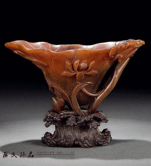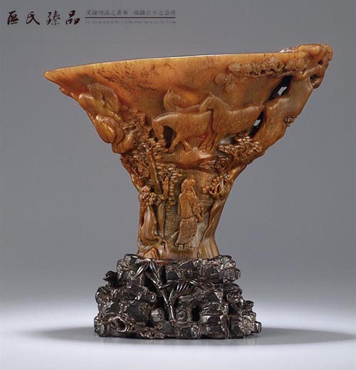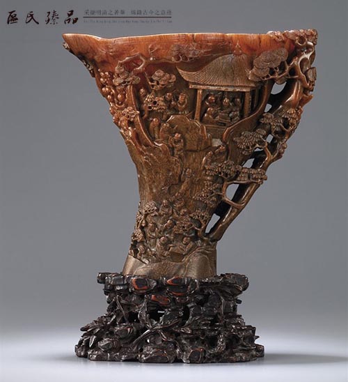 數百年來,犀角雕一直被奉為中國古代工藝品中的“絕技”,彌足珍貴。據文獻記載,至遲于西漢時期我國已有犀角雕刻編綴工藝,在南北朝石刻壁畫中,尤其是宴飲圖中,可以看到達官貴族高舉犀角觚杯祝酒慶賀的場面。到了明清時期,由于犀角難求,價比金貴,這種雕刻藝術遂走向衰落。到了現代,開始不斷有拍賣公司推出犀角雕藝術品拍賣專場,盡管數量不多,但其獨樹一幟的藝術氣質,創造出了瑰麗多彩的文化積淀,直至今日仍熠熠生輝。