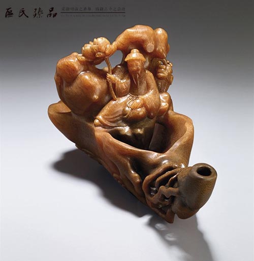 原為原為澳洲私人收藏,2006年3月29日于紐約佳士得拍賣,拍品237號。此器題材出自張騫乘槎尋找河源的典故,文人雅客常以之賦詩為文,及至明末清初此類題材仍經久不衰。槎杯通體細刻漢代名臣張騫坐槎沿江而下的情景,槎下刻旋渦紋,以示江潮滔滔;張騫手執并蒂蓮,旁置花果籃。