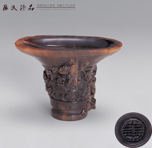 杯用犀角雕成,大口沿,方唇,口沿飾有回紋裝飾帶,杯耳由對稱的兩條夔龍構成,杯身猶如掛角方斗,滿飾仿青銅器的饕餮紋。此器為仿古造型,反映出濃厚的文化底蘊和高超的雕刻技藝,表現出宮廷藝術追求精致的物質。