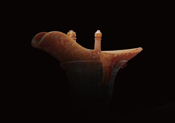 原為法國Cédric Curien家族舊藏。此件仿古犀角爵杯,淺棕色,仿古代青銅爵杯形。爵杯口兩端上翹呈長橢圓形,陰刻雷紋口沿和菊紋杯腹,又用淺浮雕的形式,在杯口壁上雕有大小螭龍四條,呈現出“蒼龍教子”之意,反映明末清初時期仿古藝術的典型風格。