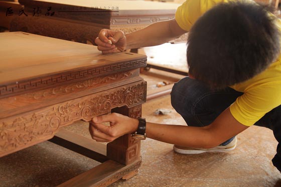 區氏的員工經常能看到區錦澤在車間和展廳走動的身影,而熟悉他的人也知道他經常到福建、云南、緬甸、老撾等地去看木頭、買木頭,早幾年,他還曾到清華大學進修過MBA,攻讀企業管理等相關課程,可謂事必躬親。2002年區錦澤進入公司時,對工藝、家具、管理是一竅不通的。“當時上班,父親安排我做的是配件采購,后來跟著廠內的驗收師傅學習打磨驗收。驗收工作需要看木工、選材、雕花和打磨,每天都在跟紅木家具制作過程中的許多環節打交道,讓我積累了豐富的專業技能。”后來接手企業管理,給了區錦澤一個大施拳腳的機會,木材選購、產品設計、質量把關、品牌推廣……他環環參與,也有了更大的話語權。“紅木老板是不能偷懶的,如果你不懂木材,不懂工藝,你就不知道你用的木頭是好木頭還是壞木頭,你就沒辦法分辨員工給你生產出來的家具是好是壞,這樣的家具怎么能放心賣給客戶呢?”現在很多朋友和客戶都會讓區錦澤幫他們看一下木材的真偽,家具的造型比例好不好等,他都能給到專業的意見。