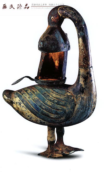 此物為大漢朝節能環保無煙雁魚銅燈,設計精巧,頗有科技含量,現收藏于山西博物院。鴻雁佇立,回首銜魚,雁頸與燈體以子母口相接,魚身與雁頸、腹腔中空相通。圓形燈盤附柄,可自由轉動,盤下圈足與雁背直口套合。魚腹部與燈盤相對應為圓形覆口,覆口與燈盤之間插立兩塊弧形屏板,交錯開合,既能擋風,又可調節燈光亮度,燈火點燃時,煙霧通過魚腹和雁頸導入雁腹,可防止油煙污染空氣。