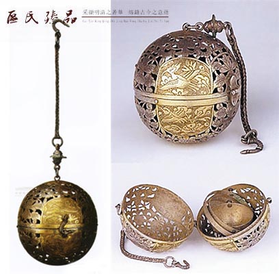被中香爐是中國古代盛香料熏被褥的球形小爐。又稱“香熏球”、“臥褥香爐”、“熏球”。它的球形外殼和位于中心的半球形爐體之間有兩層或三層同心圓環。爐體在徑向兩端各有短軸,支承在內環的兩個徑向孔內,能自由轉動。同樣,內環支承在外環上,外環支承在球形外殼的內壁上。爐體、內環、外環和外殼內壁的支承軸線依次互相垂直。爐體設計巧妙之處就在于重力作用下,不論球如何滾轉,爐口總是保持水平狀態,絲毫不用擔心火炭會傾覆。
