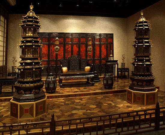 據說里面有一對紫檀描金七重檐寶塔,是清代達官貴族獻給乾隆母親的壽禮。后來文物流失英國,馬未都先生在蘇富比拍賣會上以350萬元的價格拍下,終于使其回歸故里。此外工藝館展也有展出清代的漆家具。