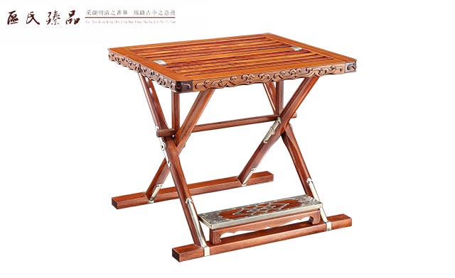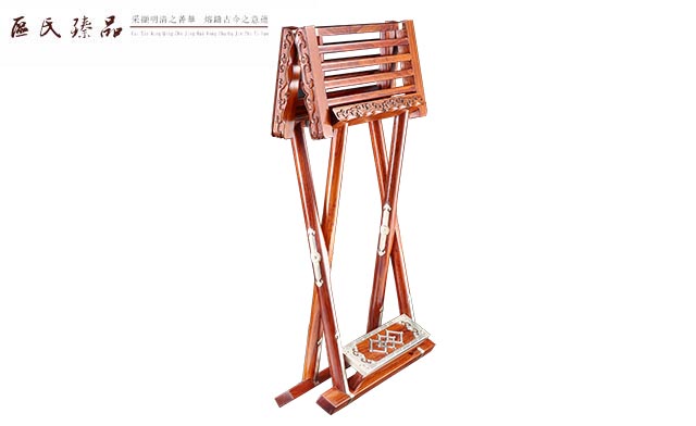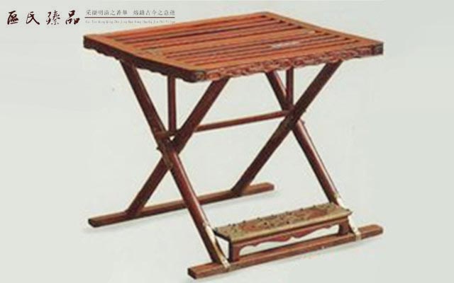 上折式交杌的結構,比普通的馬扎復雜得多。交杌面用直棱組成木框,木框中縫下有支架,用銅環與木框連接。當木框放平可以就坐時,支架恰好落在杌腿相交處,使杌面得以保持平正并承荷重量。