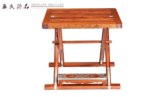 交杌折疊時,杌面須向上提折,與一般軟屜的折疊方向恰好相反,整個設計頗為精巧。交杌大邊雕螭龍紋,一側設可翻轉的腳踏。腿足相交處以銅軸銜接,腿足與底棖交圈處,以及凳面中軸和腳踏面板,均裹以銅件,即加強牢固,也起到裝飾作用。