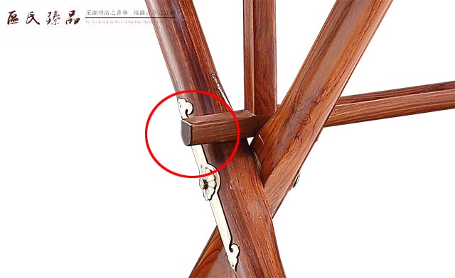 在制作交杌的過程中,區氏臻品還會不斷優化家具構造。原款交杌落在腿足相交處的支架為方形,久用后容易在腿足處形成壓痕。區氏臻品將支架改成上方下圓,增大支架與腿足的接觸面,減輕壓痕,更有利于延長交杌的壽命。
