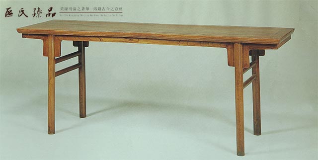 案面以標準格角榫攢邊打槽裝納木紋細密瑰麗的獨板櫸木面心,下有四根穿帶出梢支承。盡端另加橫棖交叉支承加強支承。邊抹冰盤沿上舒下斂至底壓窄平線。帶側腳的圓材腿足上端開口,嵌夾帶作肩牙頭的素牙條,以雙榫納入案面邊框底部。兩端腳足間安兩根橢圓梯棖。