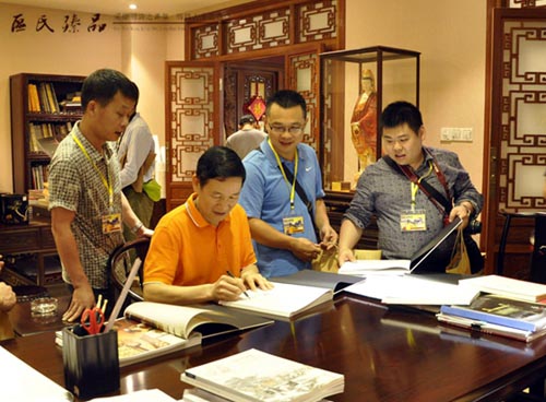 平時經常在展廳里走動的,除了客戶、銷售員外,還有很多的紅木愛好者,有本地的,也有國外的。他們因為區氏臻品而相聚,也因為區氏家具有了共同的話題。早年因著收購古舊家具的機緣,區勝春認識了很多志同道合的朋友,也和其中的很多人結下了革命般的情誼。現在,只要有閑暇的時間,品一盞香茗,細訴一段紅木故事,這是屬于他與老朋友之間的樂趣。
