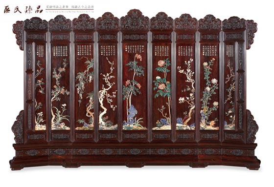 區氏臻品生產的該座屏,帶底座而不可折疊,古時多用于主座后之屏障,以顯其貴,史載:“天子當屏而立”,即言此理也。此屏分九扇,首尾兩扇斜向外展,遂使全屏站姿,有似圍屏拱立,氣象恢宏,巍然肅穆。各扇亦如圍屏型制,屏帽餿成如意云形,其上浮雕西番蓮花紋。屏心居中均以百寶玉石嵌飾為四時花卉:榴火自紅,牡丹鮮艷,共著四季勝景;寒梅傲放,玉茗羞開,各具百花性情,應目琳瑯,五彩斑斕;群芳爭艷,一屏獨攬,非惟工藝之精,亦罐匠心之妙。屏心上下,皆攢框刷槽裝絳環板,其上亦雕以西番蓮花紋,互作呼應,布局嚴謹。又各處大框、子框通作打,凹凸起伏,觀之宛如劈料而就,工細入微,收致奇韻。下承須彌座,氣勢雄渾,堪輿承重,末以云紋足落地。此屏形制恢宏,肅穆大氣,深追清宮御制之精要,允稱傳世重器之典范。