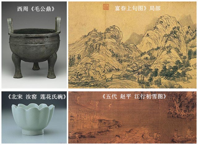 其中,《西周 毛公鼎》、《西周散氏盤》、《唐 顏真卿 祭侄文稿》、《宋 蘇軾 黃州寒食帖》、《五代 趙干 江行初雪圖》、《北宋 范寬 溪山行旅圖》、《元 黃公望 富春山居圖》、《北宋 汝窯 天青無紋水仙盆》、《北宋 汝窯 蓮花氏碗》、《清朝 翠玉白菜》被稱之為臺北故宮博物院十大鎮觀之寶。博物院經常維持有5000件左右的書畫、文物展出,并定期或不定期地舉辦各種特展。館內的展品每3個月更換1次。