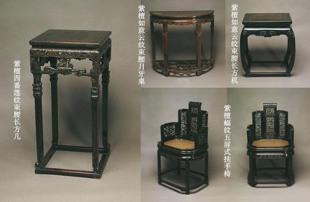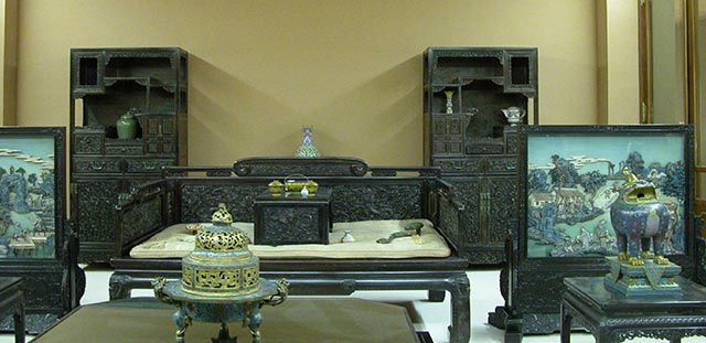 在臺北故宮博物院優雅的展廳內陳列著一堂清代紫檀家具。這批紫檀家具用料奢華、工藝精湛、雕琢細膩、紋飾華麗。從工、料、紋、形等方面多元素地向參觀的觀眾炫耀著它那高貴純正的清宮“血統”,并以其獨具的霸氣彰顯著它那曾經的輝煌。展覽說明介紹這樣描述:“二室中陳列的家具乃清代恭親王府第設置之物,質材多為紫檀木……王榻、王座、平頭案等皆為云南紫檀所雕制,花紋屬深雕,以云龍紋為主。繁密瑰麗卻不失生動靈秀,誠屬家具中的精品。古董柜一對,除柜面有雕工精致的紋飾之外,柜子內壁、背、側三面以及屜匣內壁皆彩繪漆畫耕織圖,精致可觀,為清代宮廷家具的特色。彩染象牙浮雕嵌板屏風一組,亦以紫檀鑲座,畫題為十八學士登瀛洲圖。王座兩端的燈具是標準的清宮立燈格局,燈座造型為象托寶瓶,寓意‘太平有象’。為求展示生動,本院珍藏瓷器琺瑯器等配合家具陳設,作一整體性的展出。”