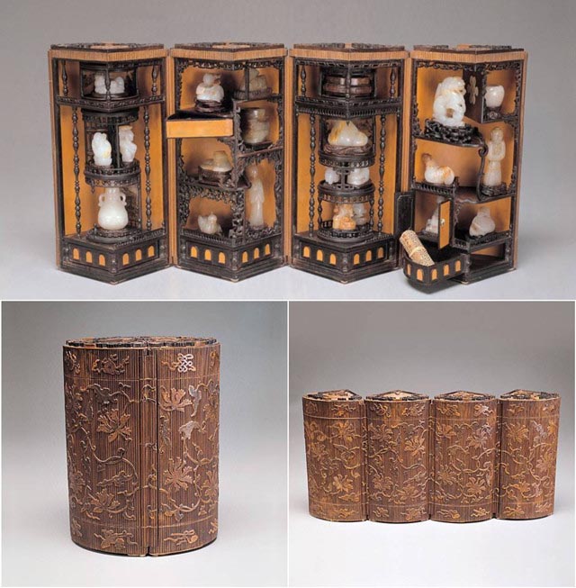 這件圓盒外壁用竹絲拼接后再黏飾纏枝番蓮紋竹黃片,并且利用機軸原理,將圓筒形盒分成四個扇形,180°打開來可成為一字形小屏風,360°翻轉后可成為一個正方形筒狀。每個扇形內又分成許多格層,其中圓柱形格層不但再分成數格,而且可以360°旋轉。全器匠心獨運,極盡設計之能事。