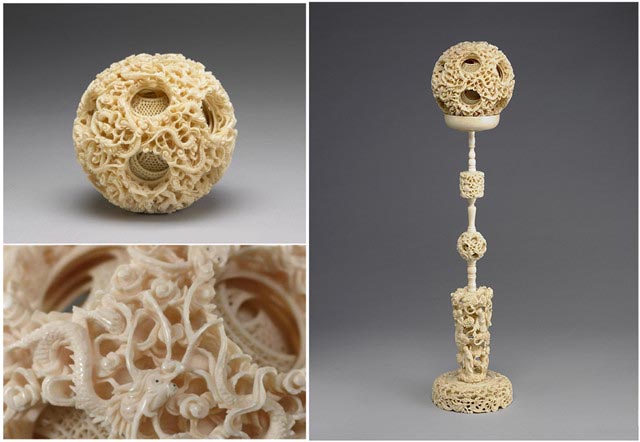 象牙球的制作,是將牙材以車床碹成球體,在球面往圓心處開出均勻分布的十四個錐形孔,用直角鉤刀在錐形孔中,一層一層由內而外刻出活動自如的套球后,再雕以各種紋樣裝飾。這件象牙套球,直徑約十二公分,表面以高浮雕刻九龍穿梭于祥云間,內部則雕刻各種鏤空精致的錦地幾何紋樣,共二十四層,每層皆可靈活轉動。套球置于有承盤的象牙座上,如同帽架,其底座同樣雕有云龍紋,往上為鏤雕八仙,中間則有一顆雕有九層的云龍紋套球,再上則雕以山水人物。層層相套,玲瓏剔透且制作繁復的象牙球,可說是清代晚期牙雕工藝之代表。