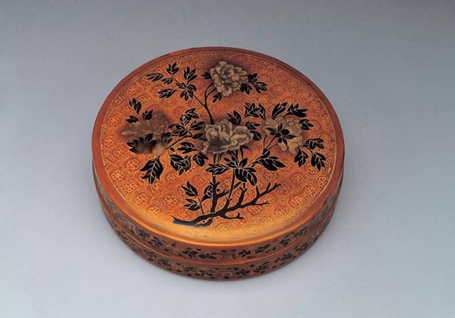蔗段式圓盒,平頂直壁,平底淺凹人。蓋面及周壁以填漆為飾。蓋面為朱地黃輝觀牡丹花叢,花色以銀粉漆為之,色粉微渙散;枝葉則黑漆黃理。周壁飾卷草紋間八梵字,梵字亦以銀漆為之。器底及里均朱紅漆。明末高友荊《燕市漆器歌》云:“品題第一號填漆,再次波羅次剔紅”,足見填漆器在當時比犀皮(波羅)、雕漆(剔紅)等漆藝的評價還高。本件漆盒采用鏤嵌、磨顯兩種填漆工藝使漆面齊平,色彩嫵媚,圖案如畫,實為不可多得的珍品。