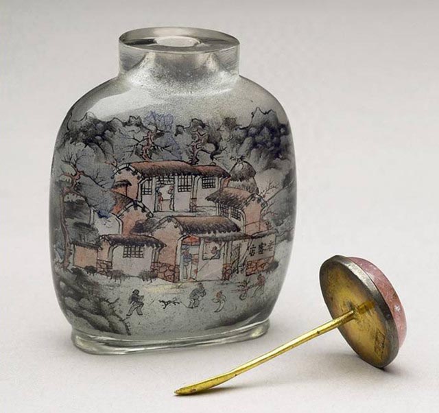 有清一代,隨著鼻煙的風行普及,鼻煙壺相當流行,嘉慶時期在鼻煙壺制作上的重大創新,就是內繪技法的使用。在小小的玻璃鼻煙壺內壁作畫,先以金剛砂和小鋼珠倒入壺內搖晃,讓表面變粗糙,顏料容易附著,再以特制有弧度彎頭的細尖竹筆,伸入口徑往往不到半公分的壺內描繪。此件作品描繪鄉野景致,人物、建筑的精細繪制,山石甚至作出渲染的效果,一面近頸處有工匠署名:“寫于冬月,周樂元作”,屬清宮舊藏。