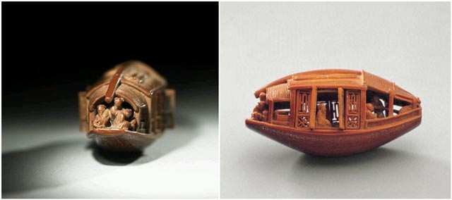 來自廣東,于雍正時期已進入造辦處的陳祖章,在乾隆二年(1737),依照橄欖核天然的外形,將一個果核雕琢成一艘小船,船上乘載八人,每一位人物的動態、表情各有不同。最特別的是,船底刻蘇軾的〈后赤壁賦〉全文,三百余字,細密井然,堪稱鬼斧神工。