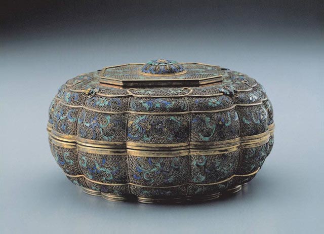 在鍍金的盒身之上,以純熟的金工制作致密的雙層纍絲網裝飾,網上的重點紋飾,花葉、壽字和蝙蝠,填燒色澤鮮艷的琺瑯釉。此種點填烘烤琺瑯釉的技法,俗稱為點藍或燒藍。精細致密的多層金絲紋飾,再加上琺瑯藍釉的點綴,光彩奪目。
