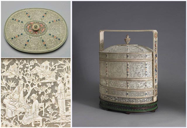 此件提食盒之盒身設計分成四層屜格,可分層置放不同的食物。該物雕工十分之精細,主體的部分用鏤空精雕的象牙片,嵌置于框格中,背景就象是絲毯一般的直線地子,線與線之間微細到只能用巧奪天工來形容,其上還雕飾有人物、鳥、獸、庭園景物和船。蓋鈕,盒身框架及提手,都有染有淡藍或紅色來點綴。提把上刻有中國傳統的八仙人物,蓋鈕則象是一件西洋帶蓋高足瓶,還有紅色緞帶裝飾。